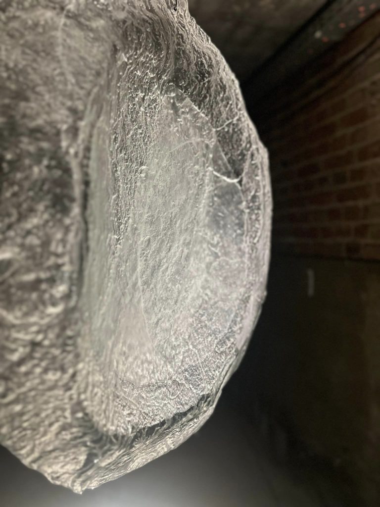 Installation composée d’une sculpture en verre suspendue et d’un dispositif sonore.