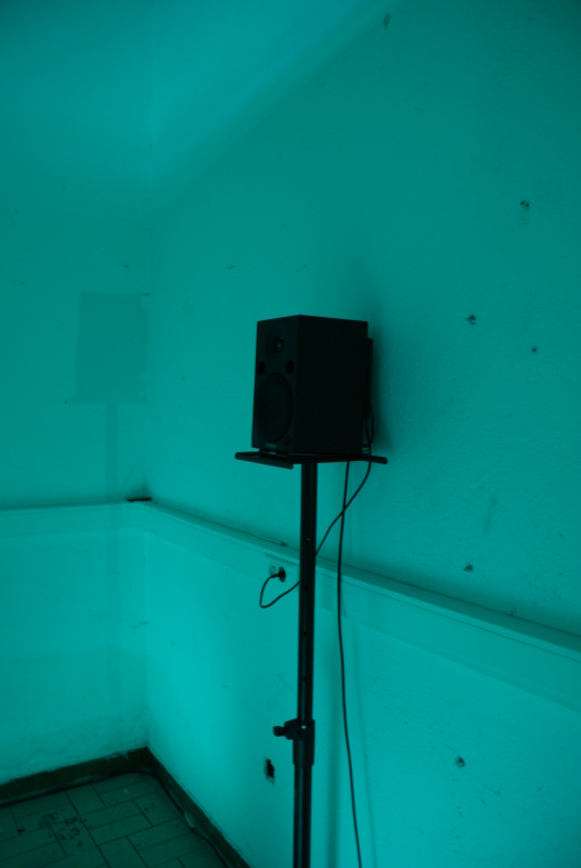 Diapason is a in situ mix media installation that tries to revel the acoustic of the site in which it settles down. A same frequency is scattered on two speakers, it’s wavelength is calculated by the distance between the speakers, this produces acoustic knots in the space and a dephazing sound. When we take a walk, we perceive sound and space differently. At the place where sound waves meet, a pressure emerges that we can physically feel which also modifies the voice in a